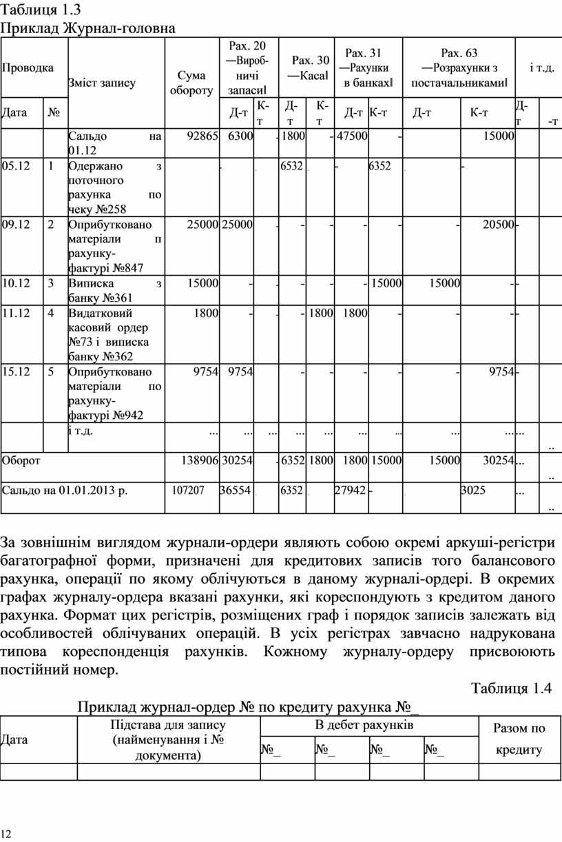 За зовнішнім виглядом журнали-ордери являють собою окремі аркуші-регістри багатографної форми, призначені для кредитових записів того балансового рахунка, операції по якому облічуються в даному журналі-ордері. В окремих графах журналу-ордера вказані рахунки, які кореспондують з кредитом даного рахунка. Формат цих регістрів, розміщених граф і порядок записів залежать від особливостей облічуваних операцій. В усіх регістрах завчасно надрукована типова кореспонденція рахунків. Кожному журналу-ордеру присвоюють постійний номер.