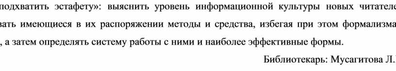 Формирование информационной культуры личности – сложный и непрерывный процесс, в котором участие библиотеки является лишь одной из составляющих. Поэтому библиотеки должны «подхватить эстафету»: выяснить уровень информационной культуры новых читателей, использовать имеющиеся в их распоряжении методы и средства, избегая при этом формализма и бездушия, а затем определять систему работы с ними и наиболее эффективные формы.