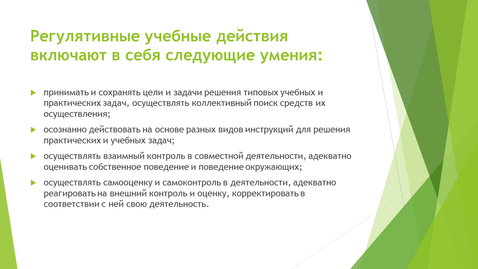 Регулятивные учебные действия включают в себя следующие умения: