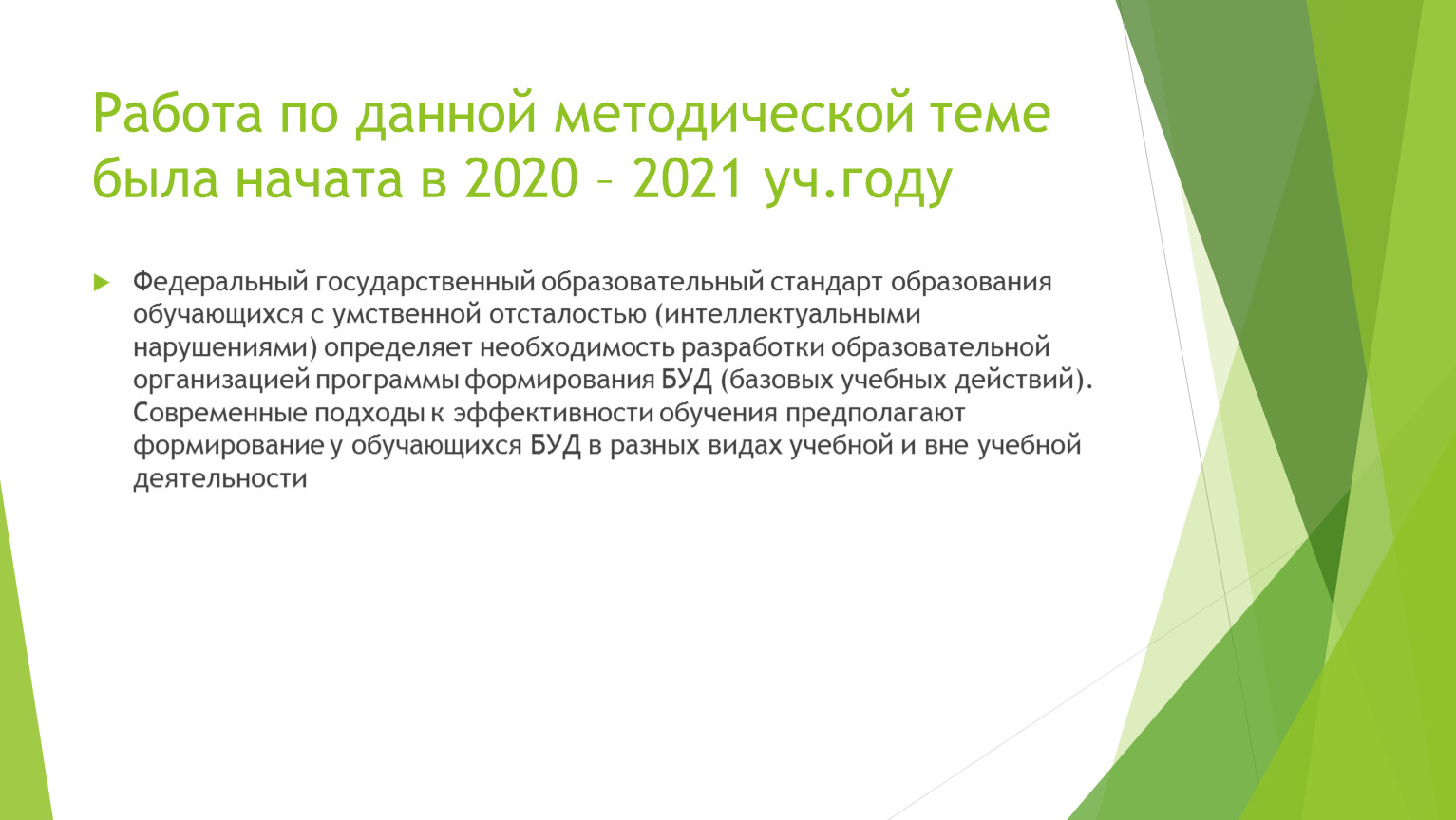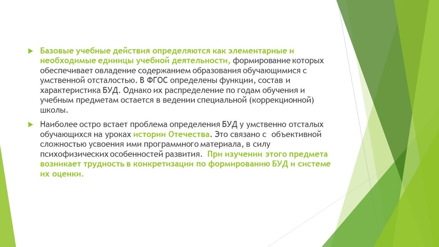 Базовые учебные действия определяются как элементарные и необходимые единицы учебной деятельности, формирование которых обеспечивает овладение содержанием образования обучающимися с умственной отсталостью. В ФГОС определены функции, состав и характеристика БУД. Однако их распределение по годам обучения и учебным предметам остается в ведении специальной (коррекционной) школы.