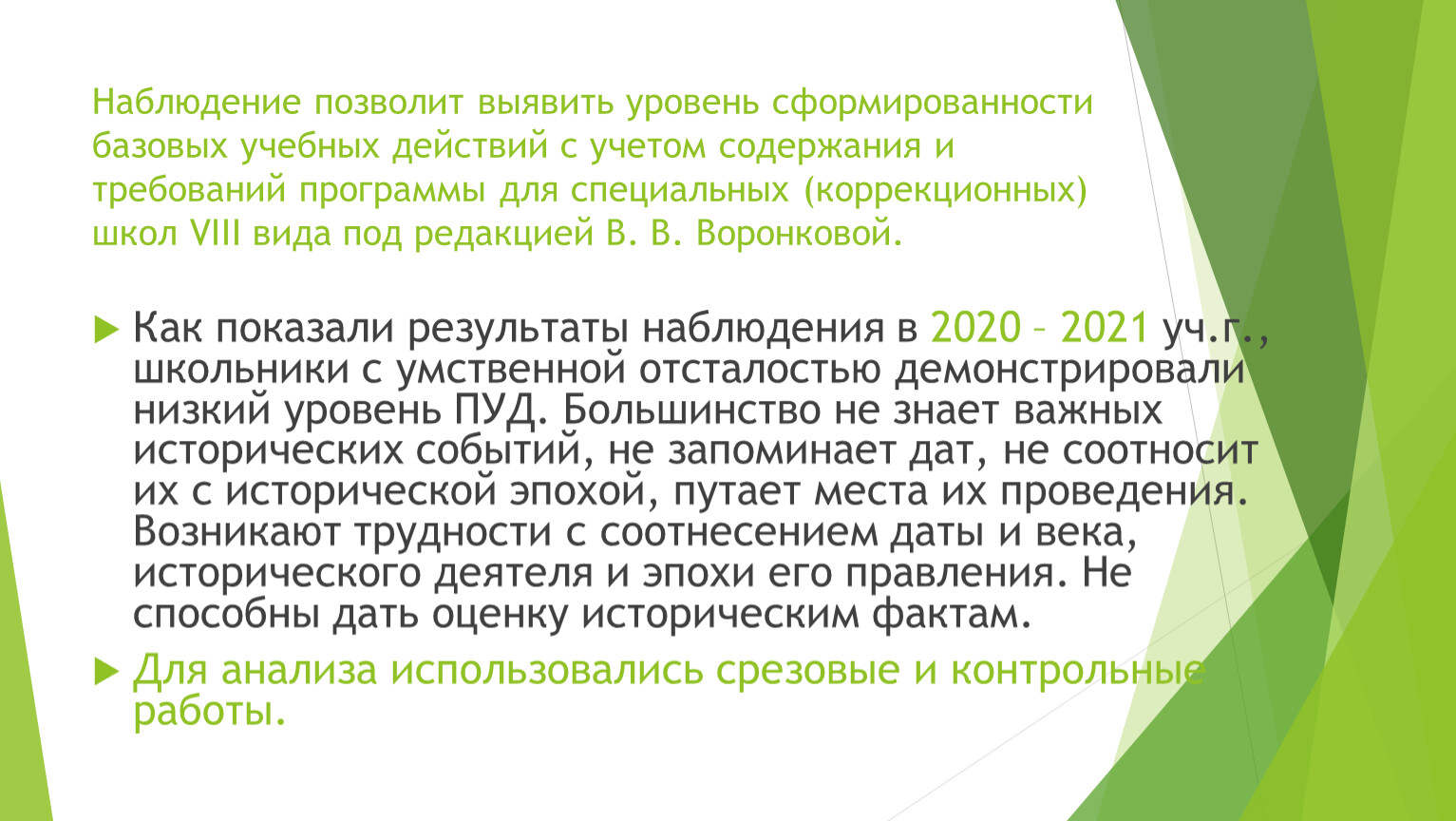 Как показали результаты наблюдения в 2020 – 2021 уч.г., школьники с умственной отсталостью демонстрировали низкий уровень ПУД. Большинство не знает важных исторических событий, не запоминает дат, не соотносит их с исторической эпохой, путает места их проведения. Возникают трудности с соотнесением даты и века, исторического деятеля и эпохи его правления. Не способны дать оценку историческим фактам.