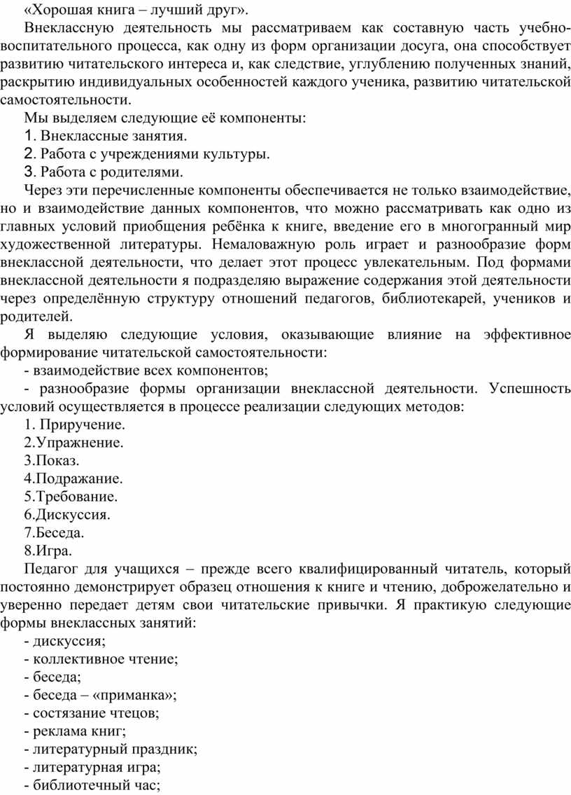 Педагог для учащихся – прежде всего квалифицированный читатель, который постоянно демонстрирует образец отношения к книге и чтению, доброжелательно и уверенно передает детям свои читательские привычки. Я практикую следующие формы внеклассных занятий: