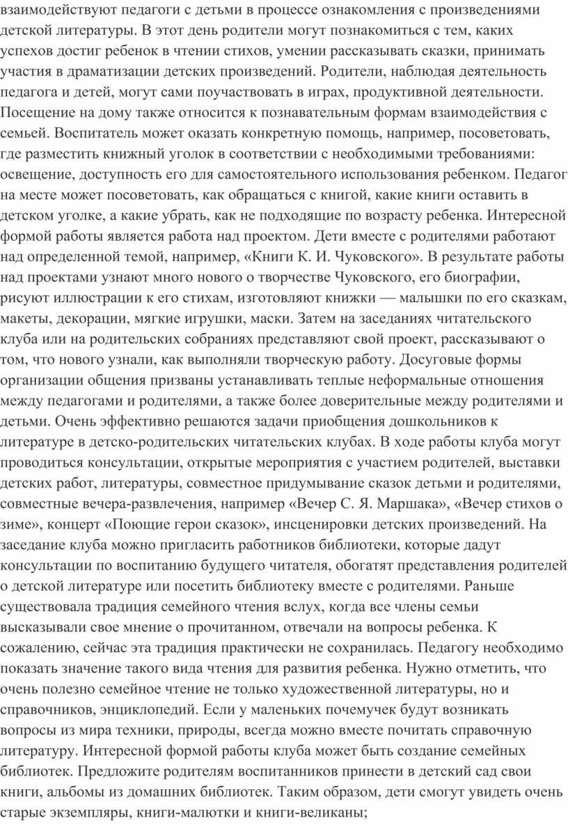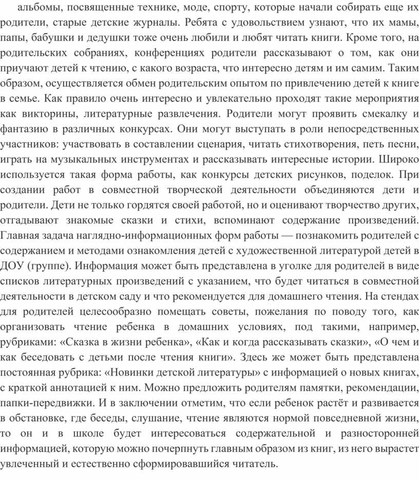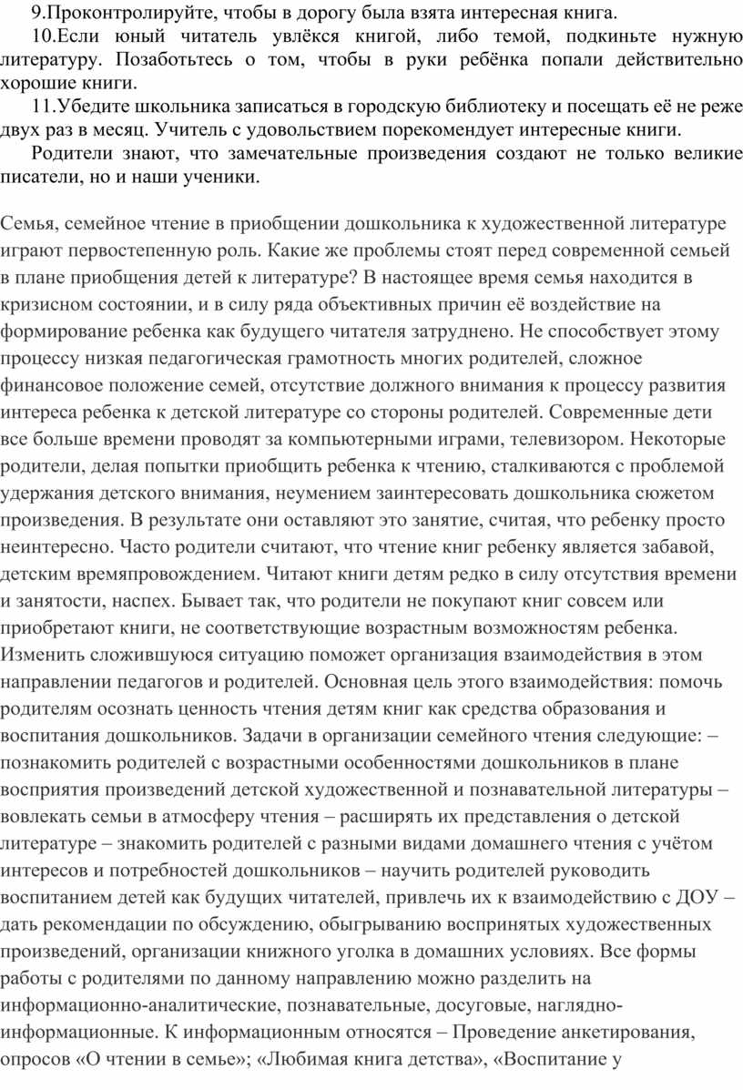 Семья, семейное чтение в приобщении дошкольника к художественной литературе играют первостепенную роль. Какие же проблемы стоят перед современной семьей в плане приобщения детей к литературе? В настоящее время семья находится в кризисном состоянии, и в силу ряда объективных причин её воздействие на формирование ребенка как будущего читателя затруднено. Не способствует этому процессу низкая педагогическая грамотность многих родителей, сложное финансовое положение семей, отсутствие должного внимания к процессу развития интереса ребенка к детской литературе со стороны родителей. Современные дети все больше времени проводят за компьютерными играми, телевизором. Некоторые родители, делая попытки приобщить ребенка к чтению, сталкиваются с проблемой удержания детского внимания, неумением заинтересовать дошкольника сюжетом произведения. В результате они оставляют это занятие, считая, что ребенку просто неинтересно. Часто родители считают, что чтение книг ребенку является забавой, детским времяпровождением. Читают книги детям редко в силу отсутствия времени и занятости, наспех. Бывает так, что родители не покупают книг совсем или приобретают книги, не соответствующие возрастным возможностям ребенка. Изменить сложившуюся ситуацию поможет организация взаимодействия в этом направлении педагогов и родителей. Основная цель этого взаимодействия: помочь родителям осознать ценность чтения детям книг как средства образования и воспитания дошкольников. Задачи в организации семейного чтения следующие: ‒ познакомить родителей с возрастными особенностями дошкольников в плане восприятия произведений детской художественной и познавательной литературы ‒ вовлекать семьи в атмосферу чтения ‒ расширять их представления о детской литературе ‒ знакомить родителей с разными видами домашнего чтения с учётом интересов и потребностей дошкольников ‒ научить родителей руководить воспитанием детей как будущих читателей, привлечь их к взаимодействию с ДОУ ‒ дать рекомендации по обсуждению, обыгрыванию воспринятых художественных произведений, организации книжного уголка в домашних условиях. Все формы работы с родителями по данному направлению можно разделить на информационно-аналитические, познавательные, досуговые, наглядно-информационные. К информационным относятся ‒ Проведение анкетирования, опросов «О чтении в семье»; «Любимая книга детства», «Воспитание у ребенка интереса и любви к книге» ‒ «Почтовый ящик» (куда родители в письменной форме помещают свои вопросы и пожелания). Они позволяют педагогам изучить состояние приобщения ребенка к книге в семье, выяснения образовательных потребностей родителей, установления контакта с её членами. Познавательные формы работы призваны знакомить родителей с рациональными методами и приемами ознакомления дошкольников с детской литературой, формируют практические навыки взаимодействия с детьми. Воспитатель проводит индивидуальные консультации и беседы с родителями на конкретные, важные для той или иной семьи темы (как привлечь ребенка к слушанию книг, какие литературные места можно показать детям в выходной день, как использовать книгу для развития связной речи). Очень важно консультируя родителей показать, как нужно работать с книгой. Ее нужно не просто читать ребенку,
