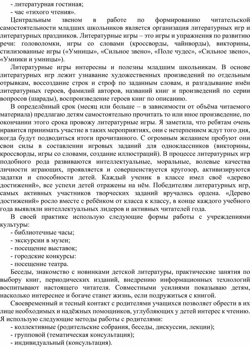 Своевременный и тесный контакт с родителями учащихся позволяет обрести в их лице необходимых и надёжных помощников, углубляющих у детей интерес к чтению. Я использую следующие методы работы с родителями: