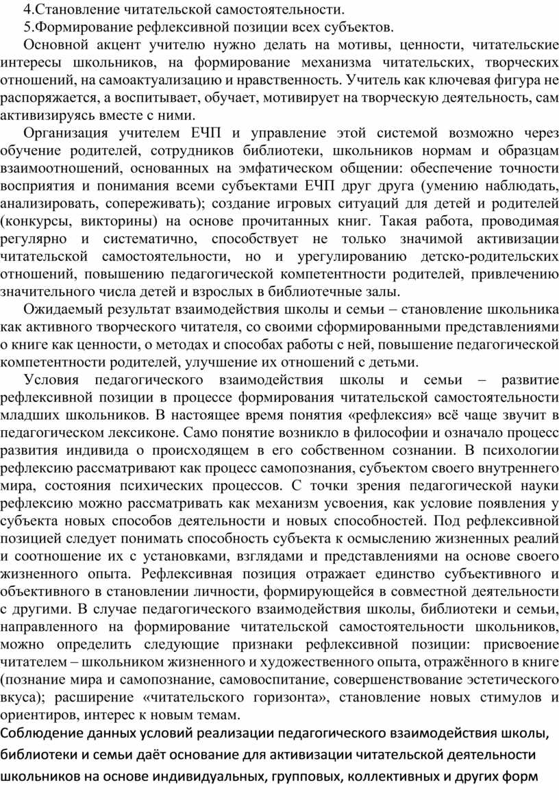 Соблюдение данных условий реализации педагогического взаимодействия школы, библиотеки и семьи даёт основание для активизации читательской деятельности школьников на основе индивидуальных, групповых, коллективных и других форм работы во всех сферах специально организованного единого читательского пространства.