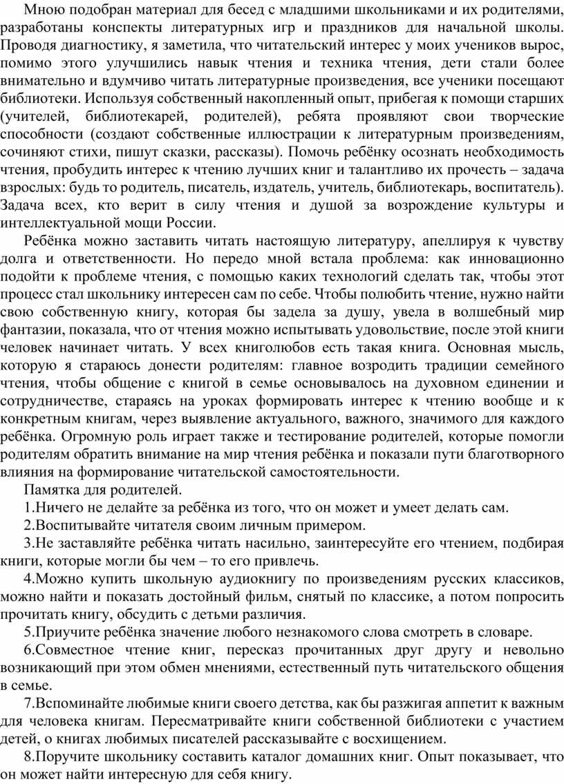 Мною подобран материал для бесед с младшими школьниками и их родителями, разработаны конспекты литературных игр и праздников для начальной школы. Проводя диагностику, я заметила, что читательский интерес у моих учеников вырос, помимо этого улучшились навык чтения и техника чтения, дети стали более внимательно и вдумчиво читать литературные произведения, все ученики посещают библиотеки. Используя собственный накопленный опыт, прибегая к помощи старших (учителей, библиотекарей, родителей), ребята проявляют свои творческие способности (создают собственные иллюстрации к литературным произведениям, сочиняют стихи, пишут сказки, рассказы). Помочь ребёнку осознать необходимость чтения, пробудить интерес к чтению лучших книг и талантливо их прочесть – задача взрослых: будь то родитель, писатель, издатель, учитель, библиотекарь, воспитатель). Задача всех, кто верит в силу чтения и душой за возрождение культуры и интеллектуальной мощи России.