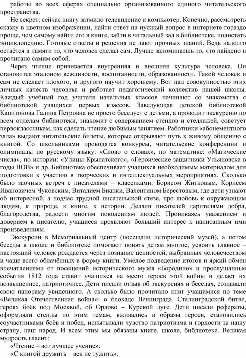 Через чтение прививается внутренняя и внешняя культура человека. Он становится эталоном вежливости, воспитанности, образованности. Такой человек и сам не сделает плохого, и другого научит хорошему. Вот над совокупностью этих личных качеств человека и работает педагогический коллектив нашей школы. Каждый учебный год учителя начальных классов начинают со знакомства с библиотекой учащихся первых классов. Заведующая детской библиотекой Капитонова Галина Петровна не просто беседует с детьми, а проводит экскурсию по всем отделам библиотеки, знакомит с содержанием стендов и стеллажей, советует первоклассникам, как сделать чтение любимым занятием. Работники «абонементного зала» выдают читательские билеты, которые открывают путь к живому общению с книгой. Со школьниками проводятся конкурсы, читательские конференции и олимпиады по русскому языку: «Слово о словах», по математике: «Магические числа», по истории: «Улицы Крылатского», «Героические защитники Ульяновска в годы ВОВ» и др. Библиотека обеспечивает учащихся необходимым материалом для подготовки к участию в творческих и интеллектуальных мероприятиях. Сколько было заочных встреч с писателями – классиками: Борисом Житковым, Корнеем Ивановичем Чуковским, Виталием Бианки, Валентином Берестовым, где дети узнают об интересной, а подчас трудной писательской стезе, про любовь к окружающим людям, к природе, к книге, к истории. Делали писателей дарителями добра, благородства, радости многим поколениям людей. Проникаясь уважением и доверием к писателю, учащиеся проявляют больший интерес к написанным ими произведениям.