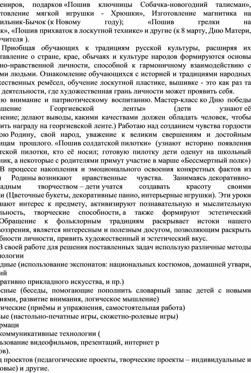 Приобщая обучающих к традициям русской культуры, расширяя их представление о стране, крае, обычаях и культуре народов формируются основы духовно-нравственной личности, способной к гармоничному взаимодействию с другими людьми. Ознакомление обучающихся с историей и традициями народных художественных ремёсел, обучение лоскутной пластике, вышивке - это как раз та сфера деятельности, где художественная грань личности может проявить себя.
