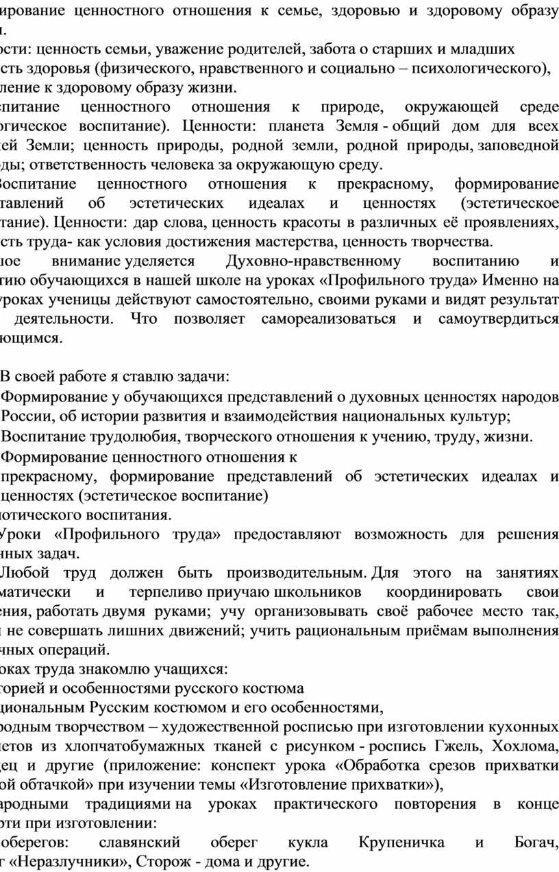 Большое внимание уделяется Духовно-нравственному воспитанию и развитию обучающихся в нашей школе на уроках «Профильного труда» Именно на этих уроках ученицы действуют самостоятельно, своими руками и видят результат своей деятельности. Что позволяет самореализоваться и самоутвердиться обучающимся.