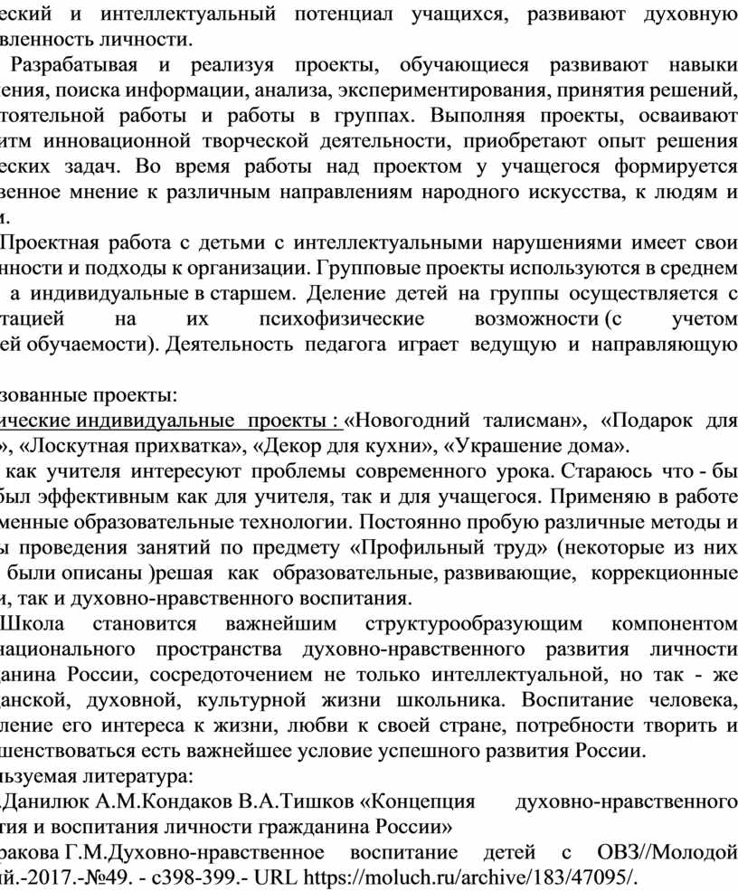 2.Петракова Г.М.Духовно-нравственное воспитание детей с ОВЗ//Молодой учёный.-2017.-№49. - с398-399.- URL https://moluch.ru/archive/183/47095/.