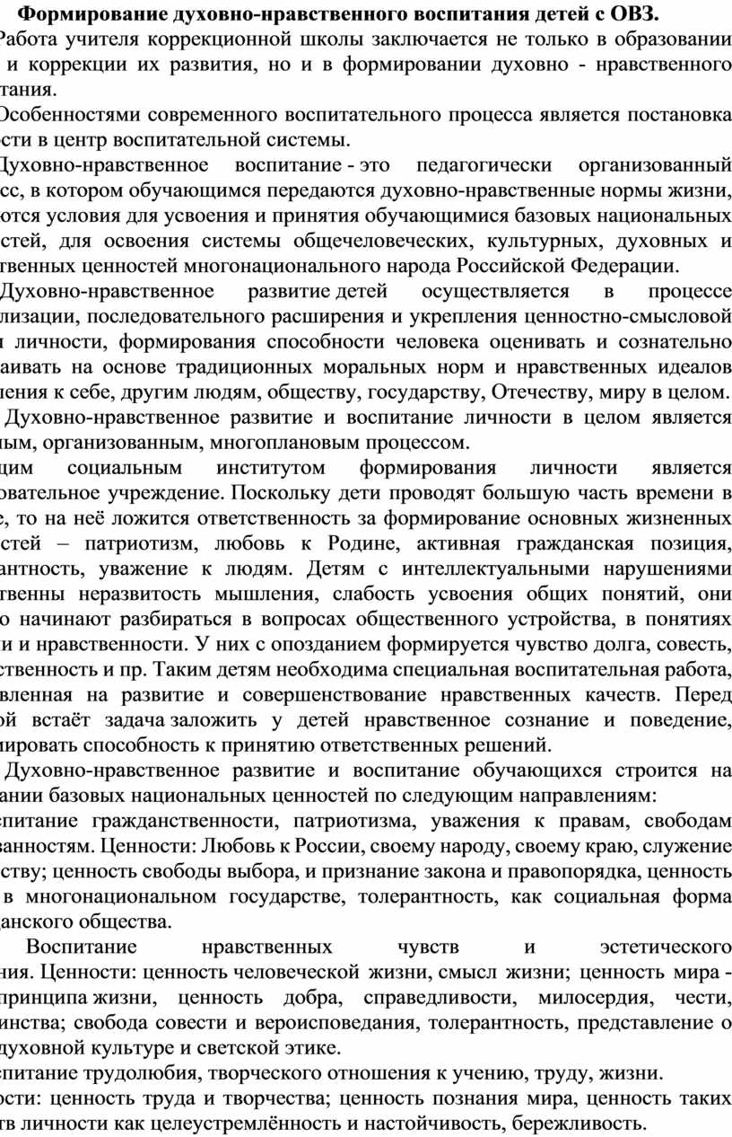 Формирование духовно-нравственного воспитания детей с ОВЗ.