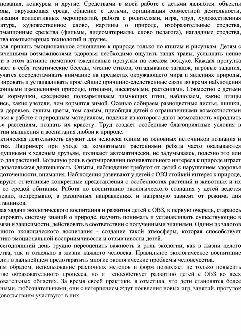 Решая задачи экологического воспитания и развития детей с ОВЗ, в первую очередь, стараюсь сформировать систему знаний о природе, научить понимать и устанавливать существующие в ней связи и зависимости, действовать в соответствии с полученными знаниями. Одним из залогов успешного экологического воспитания - создание такой атмосферы, которая способствует развитию эмоциональной восприимчивости и отзывчивости детей.