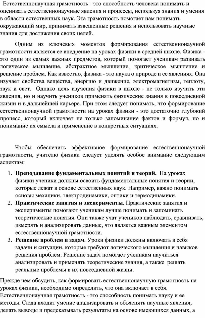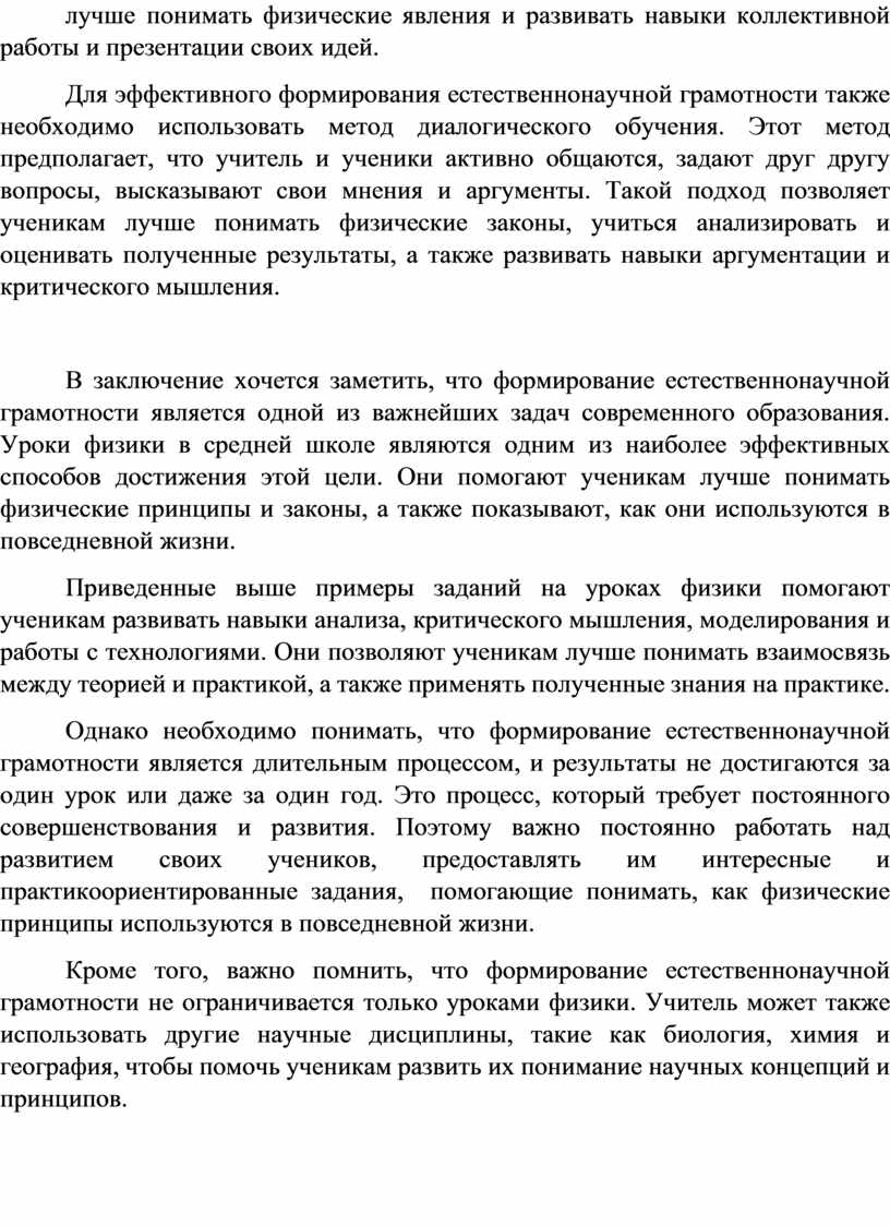 В заключение хочется заметить, что формирование естественнонаучной грамотности является одной из важнейших задач современного образования. Уроки физики в средней школе являются одним из наиболее эффективных способов достижения этой цели. Они помогают ученикам лучше понимать физические принципы и законы, а также показывают, как они используются в повседневной жизни.