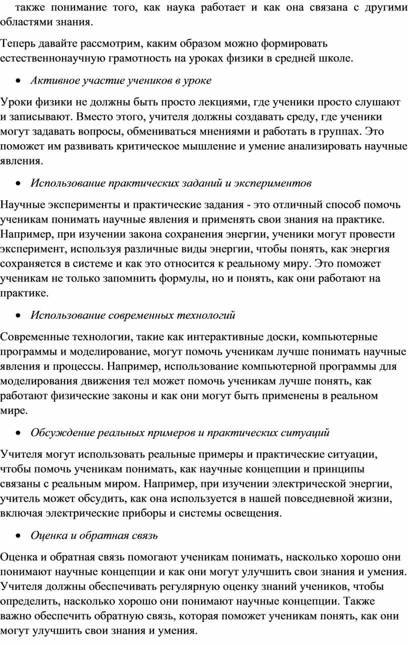 Кроме того, важно помнить, что формирование естественнонаучной грамотности не ограничивается только уроками физики. Учитель может также использовать другие научные дисциплины, такие как биология, химия и география, чтобы помочь ученикам развить их понимание научных концепций и принципов.