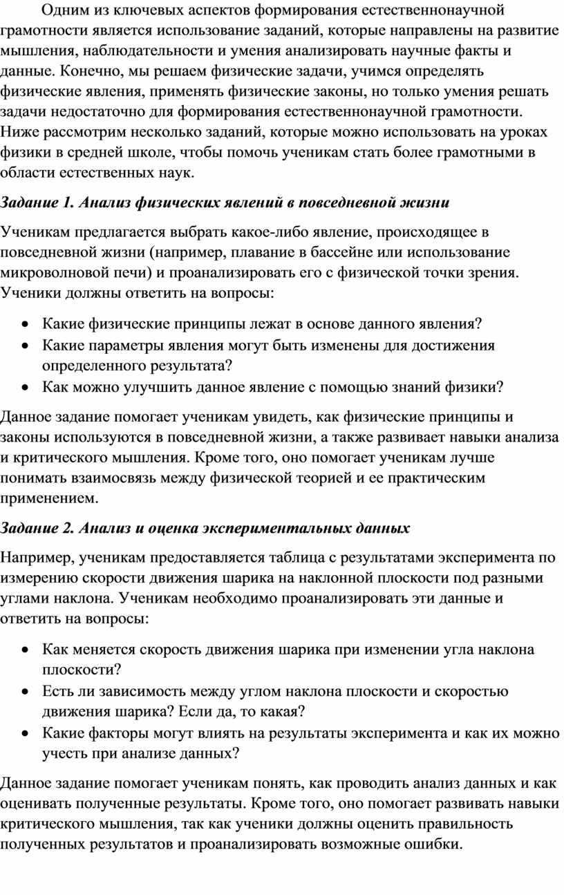 Одним из ключевых аспектов формирования естественнонаучной грамотности является использование заданий, которые направлены на развитие мышления, наблюдательности и умения анализировать научные факты и данные. Конечно, мы решаем физические задачи, учимся определять физические явления, применять физические законы, но только умения решать задачи недостаточно для формирования естественнонаучной грамотности. Ниже рассмотрим несколько заданий, которые можно использовать на уроках физики в средней школе, чтобы помочь ученикам стать более грамотными в области естественных наук.