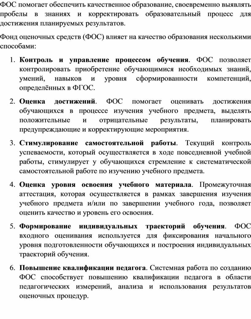 ФОС помогает обеспечить качественное образование, своевременно выявлять пробелы в знаниях и корректировать образовательный процесс для достижения планируемых результатов.