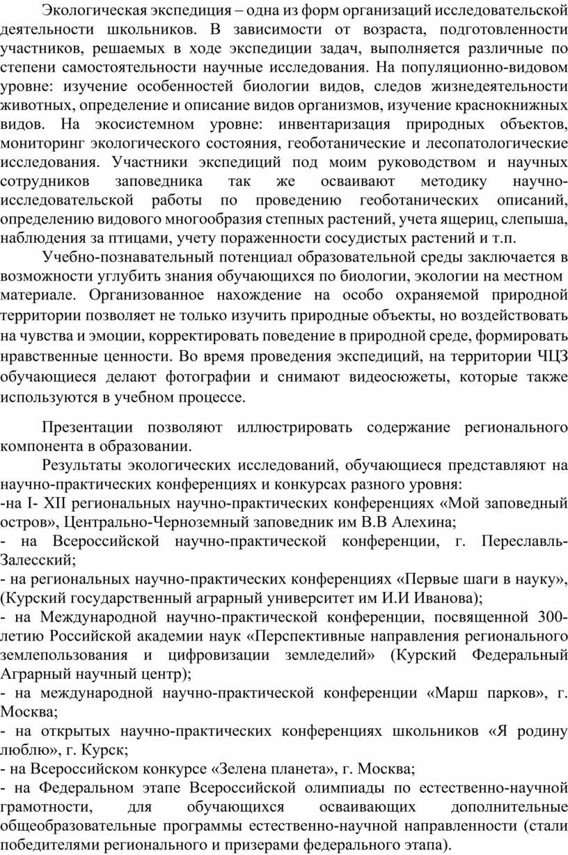 материале. Организованное нахождение на особо охраняемой природной территории позволяет не только изучить природные объекты, но воздействовать на чувства и эмоции, корректировать поведение в природной среде, формировать нравственные ценности. Во время проведения экспедиций, на территории ЧЦЗ обучающиеся делают фотографии и снимают видеосюжеты, которые также используются в учебном процессе.