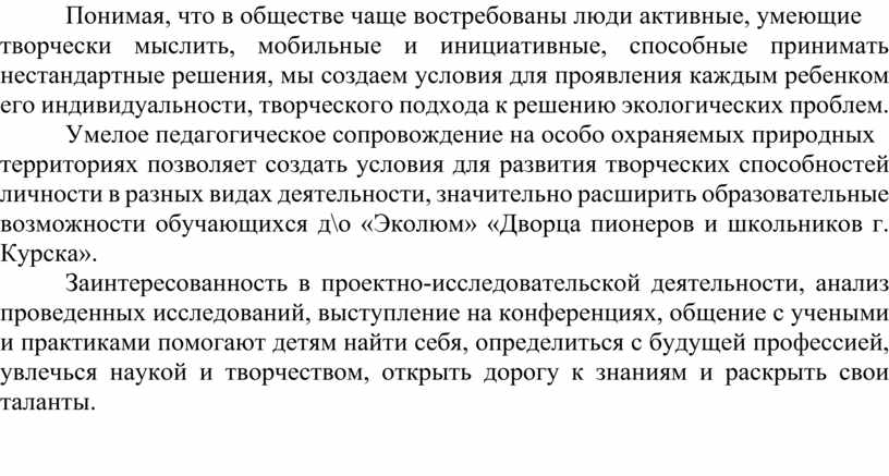 территориях позволяет создать условия для развития творческих способностей личности в разных видах деятельности, значительно расширить образовательные возможности обучающихся д\о «Эколюм» «Дворца пионеров и школьников г. Курска».