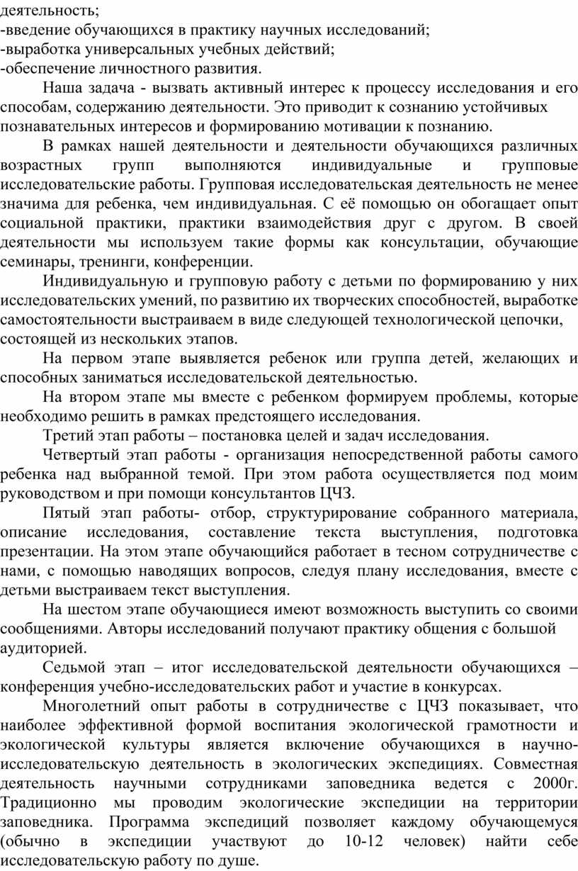 Многолетний опыт работы в сотрудничестве с ЦЧЗ показывает, что наиболее эффективной формой воспитания экологической грамотности и экологической культуры является включение обучающихся в научно-исследовательскую деятельность в экологических экспедициях. Совместная деятельность научными сотрудниками заповедника ведется с 2000г. Традиционно мы проводим экологические экспедиции на территории заповедника. Программа экспедиций позволяет каждому обучающемуся (обычно в экспедиции участвуют до 10-12 человек) найти себе исследовательскую работу по душе.