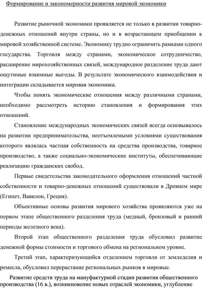 Объективные основы развития мирового хозяйства проявляются уже на первом этапе общественного разделения труда (медный, бронзовый и ранний периоды железного века).