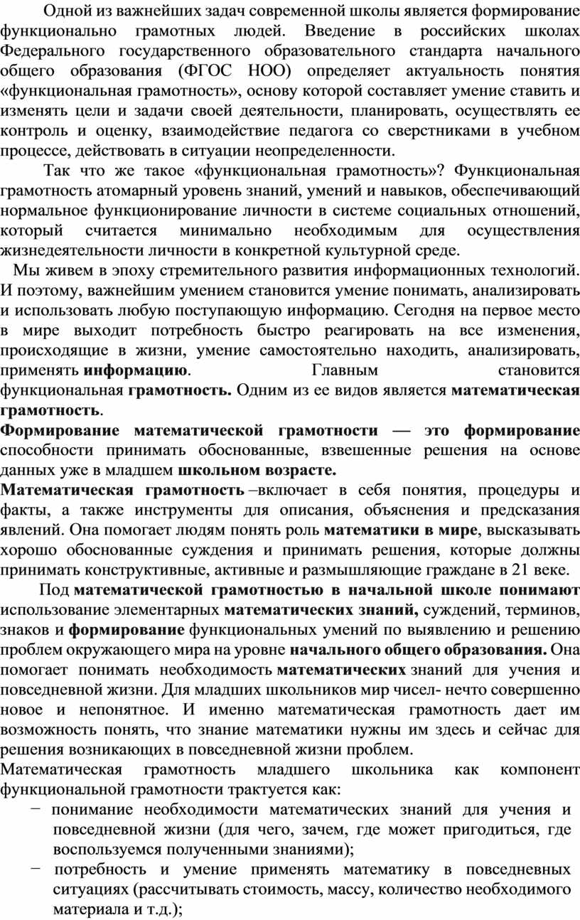 Под математической грамотностью в начальной школе понимают использование элементарных математических знаний, суждений, терминов, знаков и формирование функциональных умений по выявлению и решению проблем окружающего мира на уровне начального общего образования. Она помогает понимать необходимость математических знаний для учения и повседневной жизни. Для младших школьников мир чисел- нечто совершенно новое и непонятное. И именно математическая грамотность дает им возможность понять, что знание математики нужны им здесь и сейчас для решения возникающих в повседневной жизни проблем.
