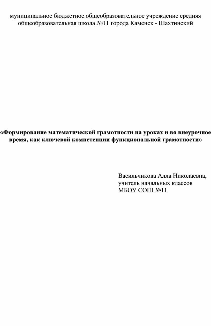 «Формирование математической грамотности на уроках и во внеурочное время, как ключевой компетенции функциональной грамотности»