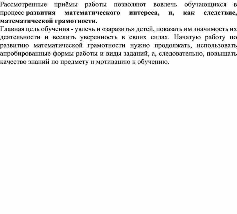 Рассмотренные приёмы работы позволяют вовлечь обучающихся в процесс развития математического интереса, и, как следствие, математической грамотности.