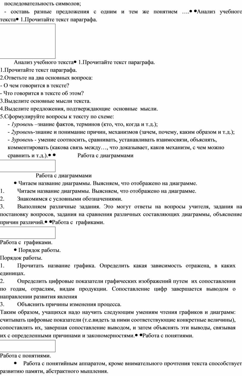 Работа с понятийным аппаратом, кроме внимательного прочтения текста способствует развитию памяти, абстрактного мышления. Алгоритм работы с понятиями: - Назвать понятие, дать его определение. - Вычленить ведущие свойства понятия, по которым оно отличается от других понятий этого рода. - Привести примеры для конкретизации понятий, найти область его применения. - Связать понятие с другими, касающимися данного предмета. - Составить небольшой рассказ, употребляя данное понятие. - Определить термин своими словами. - Назвать иной смысл понятия в какой-то другой области знаний.