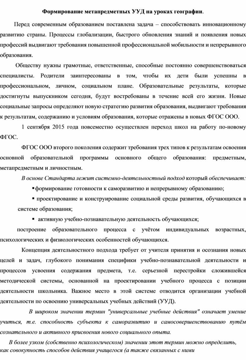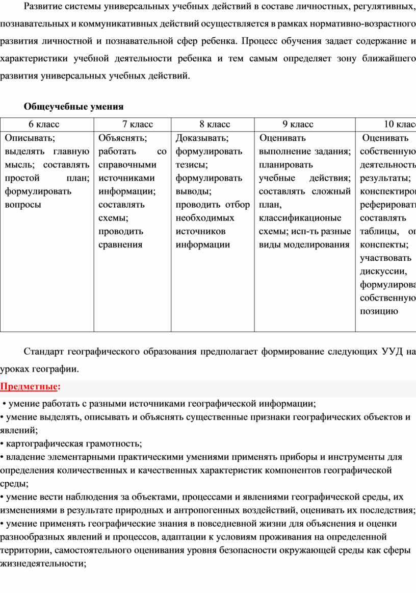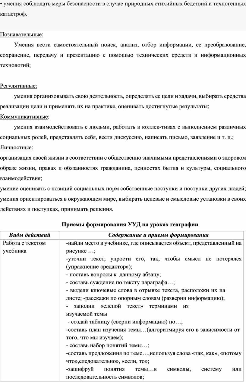 Стандарт географического образования предполагает формирование следующих УУД на уроках географии.