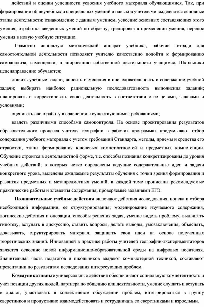 владеть различными способами самоконтроля. На основе проектирования результатов образовательного процесса учителя географии в рабочих программах продумывают отбор содержания учебного материала с учетом требований Стандарта, методы, приемы и средства его отработки, этапы формирования ключевых компетентностей и предметных компетенции. Обучение строится в деятельностной форме, т.е. способы познания конкретизированы до уровня учебных действий, в которых четко определены ведущие содержательные идеи и задачи конкретного урока, выделены ожидаемые результаты обучения с точки зрения формирования и развития предметных и метапредметных умений, в каждой теме прописаны рекомендуемые практические работы и элементы содержания, проверяемые заданиями ЕГЭ.