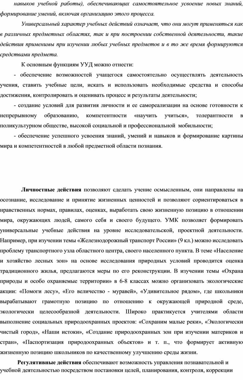 Личностные действия позволяют сделать учение осмысленным, они направлены на осознание, исследование и принятие жизненных ценностей и позволяют сориентироваться в нравственных нормах, правилах, оценках, выработать свою жизненную позицию в отношении мира, окружающих людей, самого себя и своего будущего. УМК позволяет формировать универсальные учебные действия на уровне исследовательской, проектной деятельности. Например, при изучении темы «Железнодорожный транспорт России» (9 кл.) можно исследовать проблему транспортного узла областного центра, своего населенного пункта. В теме «Население и хозяйство лесных зон» на основе исследования природных условий проводится оценка традиционного жилья, предлагаются меры по его реконструкции. В изучении темы «Охрана природы и особо охраняемые территории» в 6-8 классах можно организовать экологические акции: «Помоги лесу», «Его величество - муравей», «Удивительное рядом», где школьники вырабатывают грамотную позицию по отношению к окружающей природной среде, экологически целесообразной деятельности. Широко практикуется учителями области выполнение социальных природоохранных проектов: «Сохраним малые реки», «Экологически чистый город», «Наши истоки», «Создание природоохранных зон при изучении материков и стран», «Паспортизация природоохранных объектов» и т. п., что формирует активную жизненную позицию школьников по качественному улучшению среды жизни.