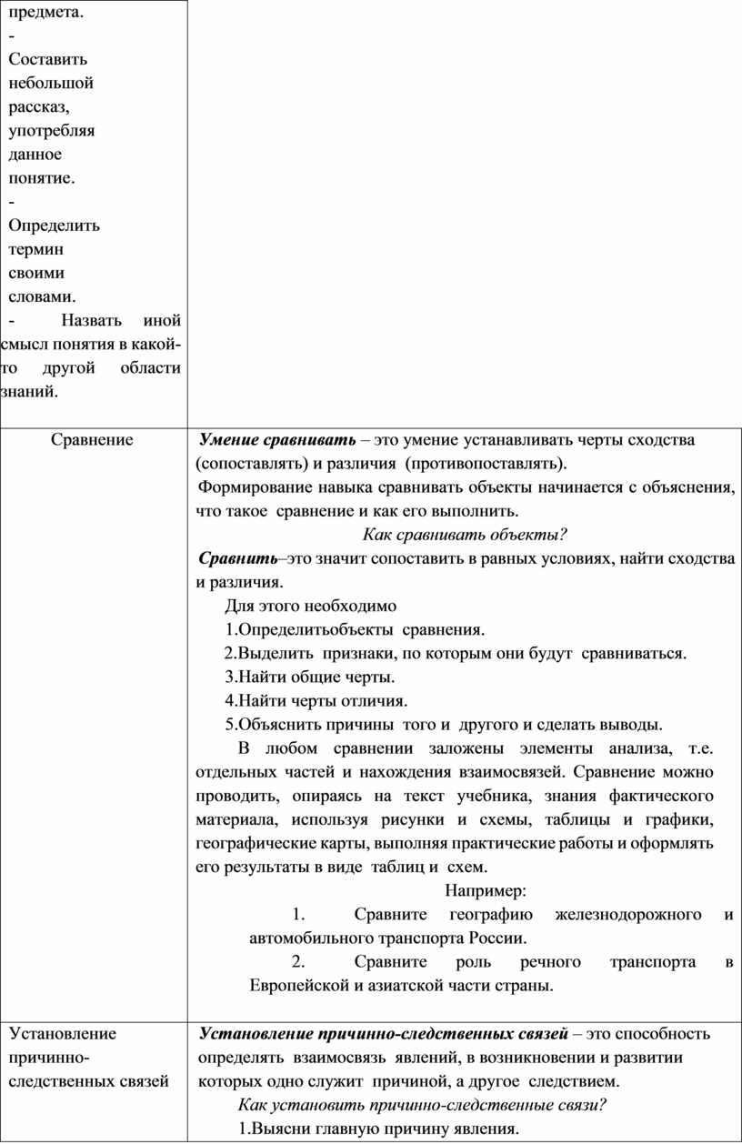Умение сравнивать – это умение устанавливать черты сходства (сопоставлять) и различия (противопоставлять). Формирование навыка сравнивать объекты начинается с объяснения, что такое сравнение и как его выполнить. Как сравнивать объекты? Сравнить–это значит сопоставить в равных условиях, найти сходства и различия. Для этого необходимо 1.Определитьобъекты сравнения. 2.Выделить признаки, по которым они будут сравниваться. 3.Найти общие черты. 4.Найти черты отличия. 5.Объяснить причины того и другого и сделать выводы. В любом сравнении заложены элементы анализа, т.е. отдельных частей и нахождения взаимосвязей. Сравнение можно проводить, опираясь на текст учебника, знания фактического материала, используя рисунки и схемы, таблицы и графики, географические карты, выполняя практические работы и оформлять его результаты в виде таблиц и схем. Например: 1. Сравните географию железнодорожного и автомобильного транспорта России. 2. Сравните роль речного транспорта в Европейской и азиатской части страны.