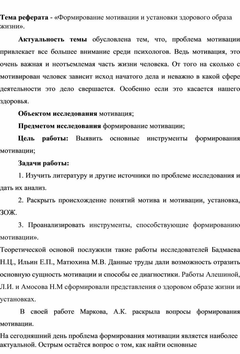 Тема реферата - «Формирование мотивации и установки здорового образа жизни».