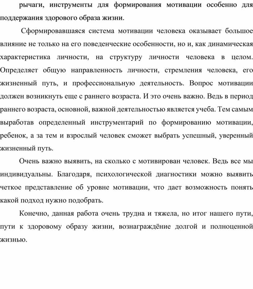 На сегодняшний день проблема формирования мотивации является наиболее актуальной. Острым остаётся вопрос о том, как найти основные рычаги, инструменты для формирования мотивации особенно для поддержания здорового образа жизни.