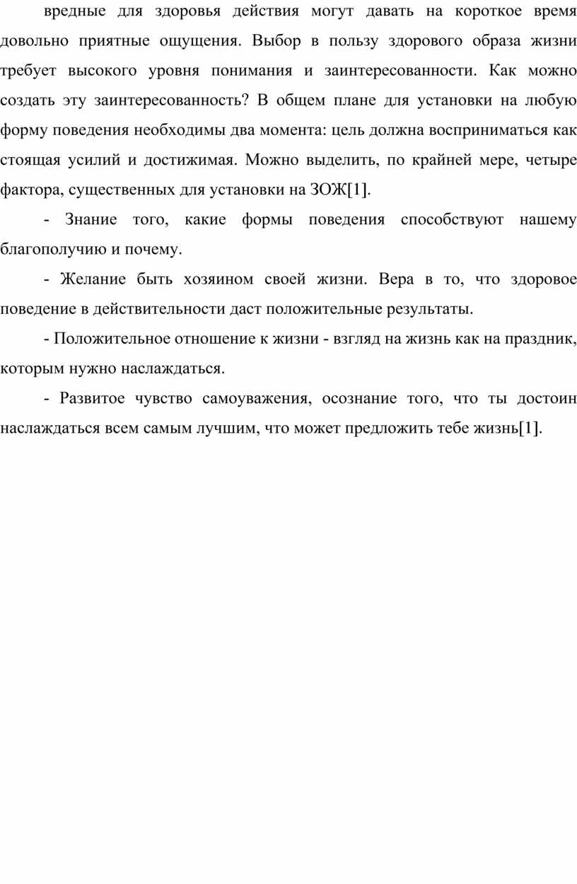 Согласно законам психологии, мы склонны повторять те виды поведения, которые приносят удовольствие, и избегаем поступков, которые влекут за собой неприятности. К сожалению, последствия здорового или нездорового поведения часто кажутся не связанными с ним. Более того, вредные для здоровья действия могут давать на короткое время довольно приятные ощущения. Выбор в пользу здорового образа жизни требует высокого уровня понимания и заинтересованности. Как можно создать эту заинтересованность? В общем плане для установки на любую форму поведения необходимы два момента: цель должна восприниматься как стоящая усилий и достижимая. Можно выделить, по крайней мере, четыре фактора, существенных для установки на ЗОЖ[1].