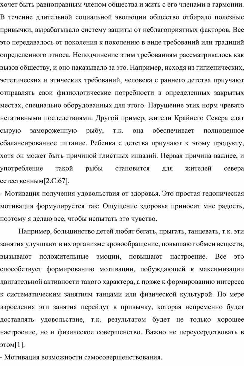 - Мотивация подчинения этнокультурным требованиям. Формулировка мотива: человек подчиняется этнокультурным требованиям потому, что хочет быть равноправным членом общества и жить с его членами в гармонии. В течение длительной социальной эволюции общество отбирало полезные привычки, вырабатывало систему защиты от неблагоприятных факторов. Все это передавалось от поколения к поколению в виде требований или традиций определенного этноса. Неподчинение этим требованиям рассматривалось как вызов обществу, и оно наказывало за это. Например, исходя из гигиенических, эстетических и этических требований, человека с раннего детства приучают отправлять свои физиологические потребности в определенных закрытых местах, специально оборудованных для этого. Нарушение этих норм чревато негативными последствиями. Другой пример, жители Крайнего Севера едят сырую замороженную рыбу, т.к. она обеспечивает полноценное сбалансированное питание. Ребенка с детства приучают к этому продукту, хотя он может быть причиной глистных инвазий. Первая причина важнее, и употребление такой рыбы становится для жителей севера естественным[2.С.67].