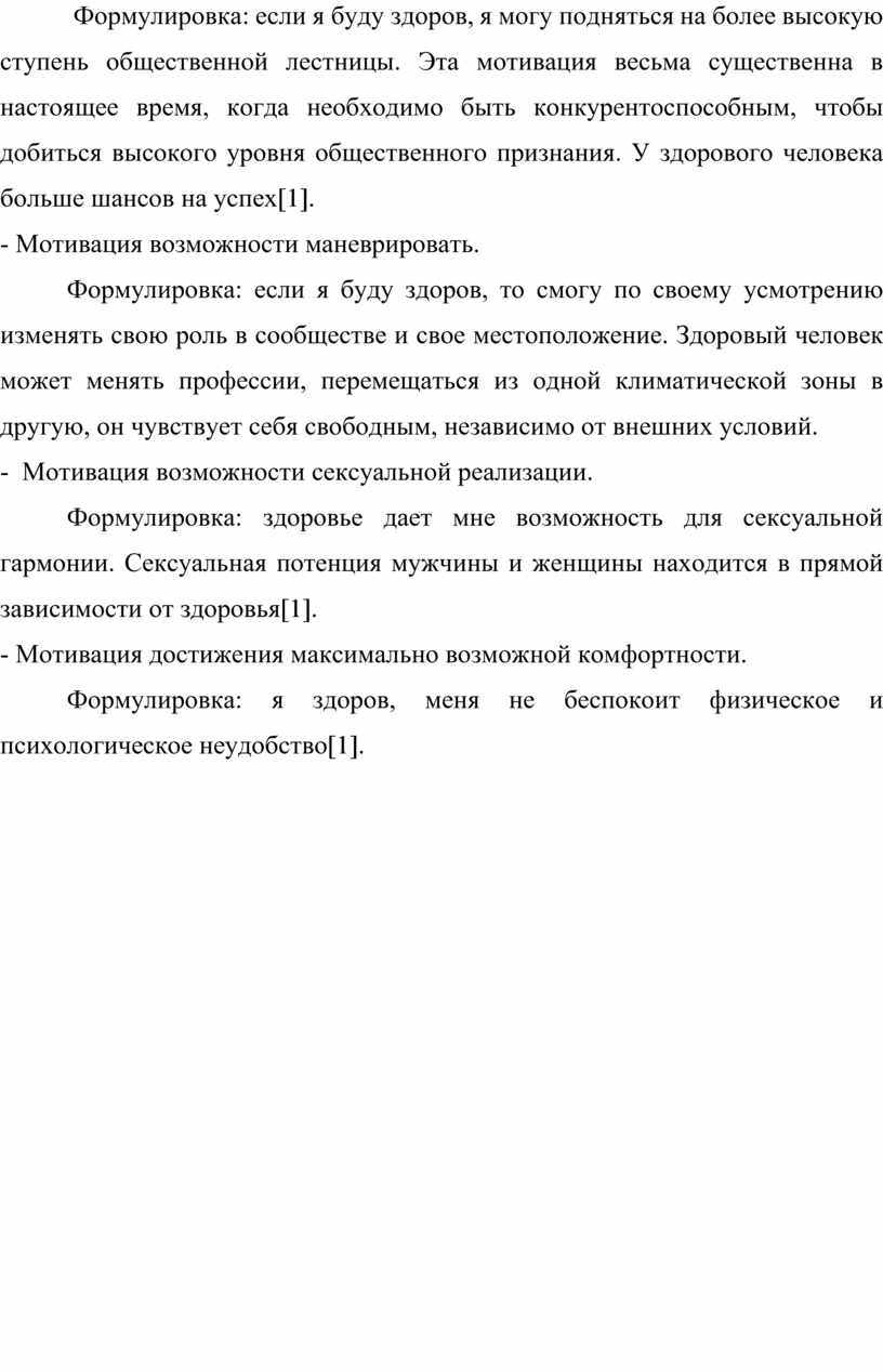 Формулировка: если я буду здоров, я могу подняться на более высокую ступень общественной лестницы. Эта мотивация весьма существенна в настоящее время, когда необходимо быть конкурентоспособным, чтобы добиться высокого уровня общественного признания. У здорового человека больше шансов на успех[1].