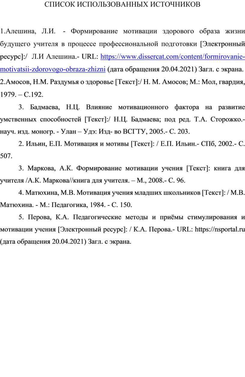 1.Алешина, Л.И. - Формирование мотивации здорового образа жизни будущего учителя в процессе профессиональной подготовки [Электронный ресурс]:/ Л.И Алешина.- URL: https://www.dissercat.com/content/formirovanie-motivatsii-zdorovogo-obraza-zhizni (дата обращения 20.04.2021) Загл. с экрана.