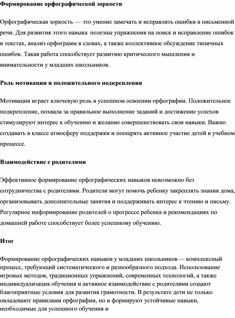 Формирование орфографических навыков у младших школьников — комплексный процесс, требующий систематического и разнообразного подхода. Использование игровых методов, традиционных упражнений, современных технологий, а также индивидуализация обучения и активное взаимодействие с родителями создают благоприятные условия для развития грамотности. В результате дети не только овладевают правилами орфографии, но и формируют устойчивые навыки, необходимые для успешного обучения и