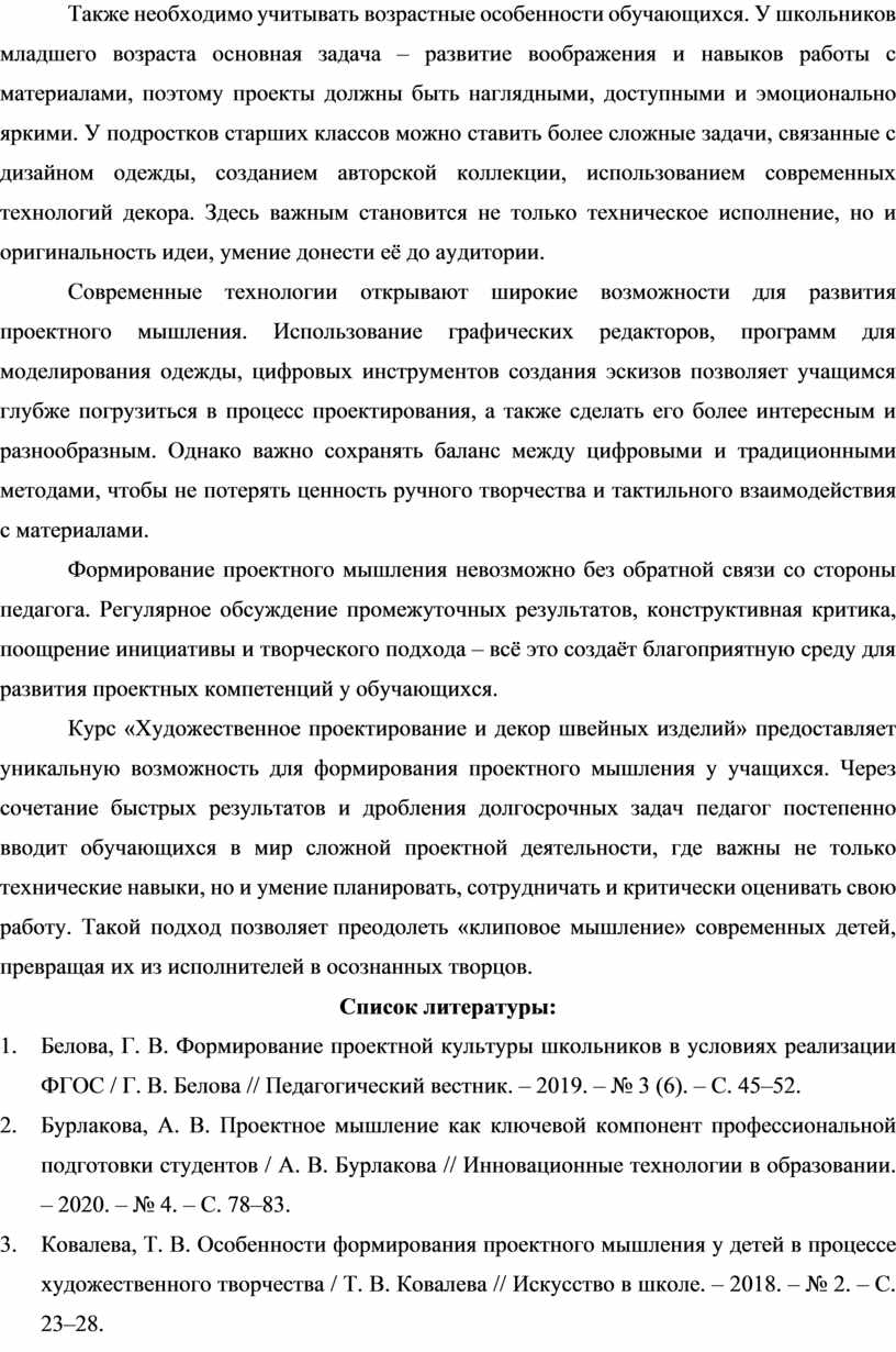 1. Белова, Г. В. Формирование проектной культуры школьников в условиях реализации ФГОС / Г. В. Белова // Педагогический вестник. – 2019. – № 3 (6). – С. 45–52.