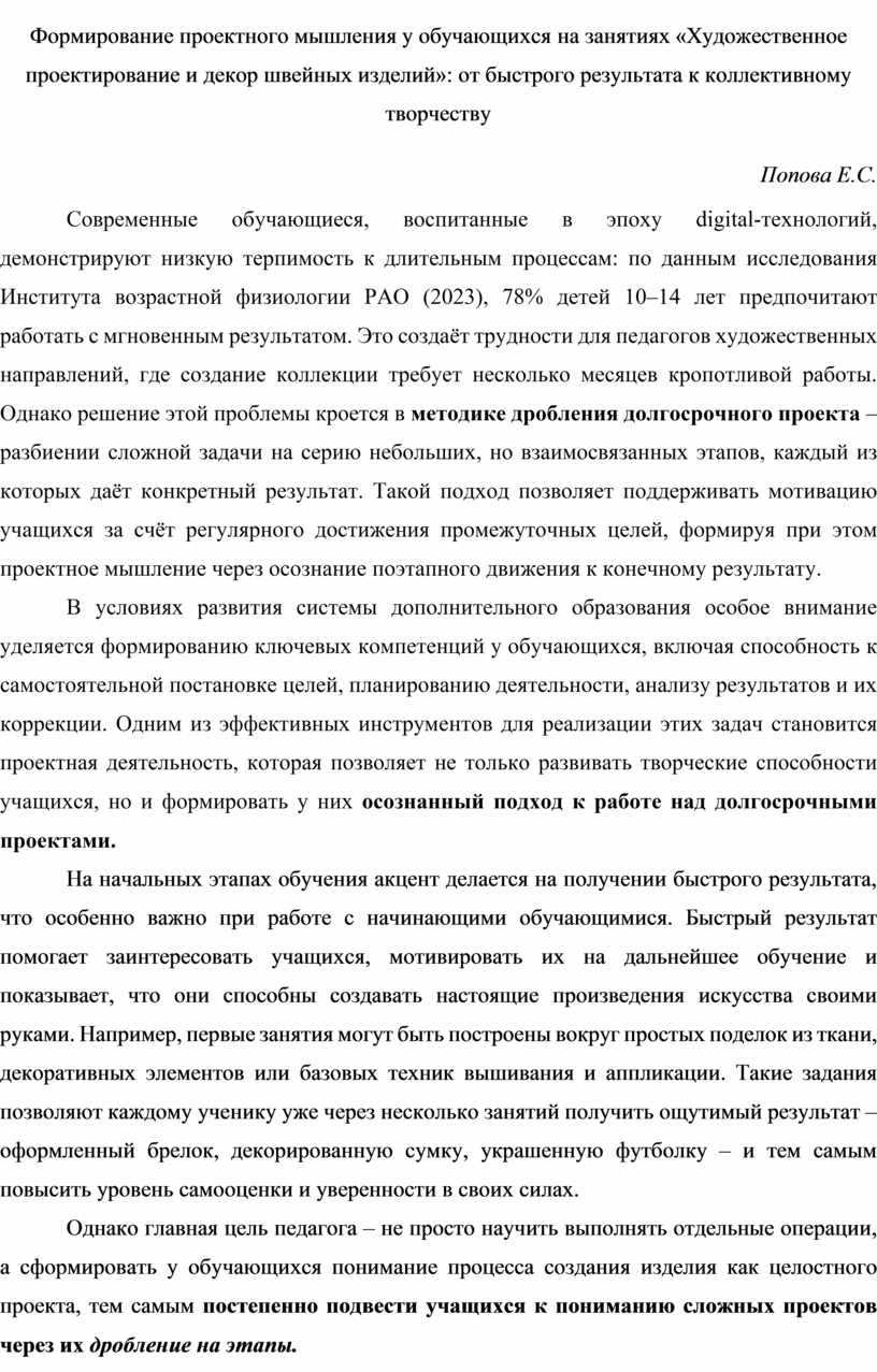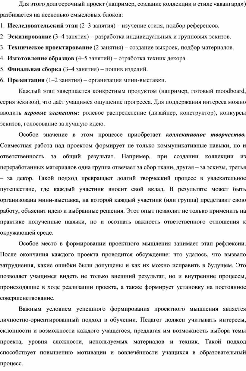 Курс «Художественное проектирование и декор швейных изделий» предоставляет уникальную возможность для формирования проектного мышления у учащихся. Через сочетание быстрых результатов и дробления долгосрочных задач педагог постепенно вводит обучающихся в мир сложной проектной деятельности, где важны не только технические навыки, но и умение планировать, сотрудничать и критически оценивать свою работу. Такой подход позволяет преодолеть «клиповое мышление» современных детей, превращая их из исполнителей в осознанных творцов.