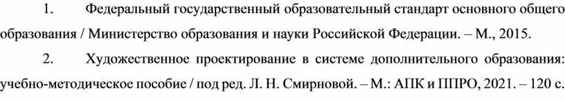 5. Художественное проектирование в системе дополнительного образования: учебно-методическое пособие / под ред. Л. Н. Смирновой. – М.: АПК и ППРО, 2021. – 120 с.