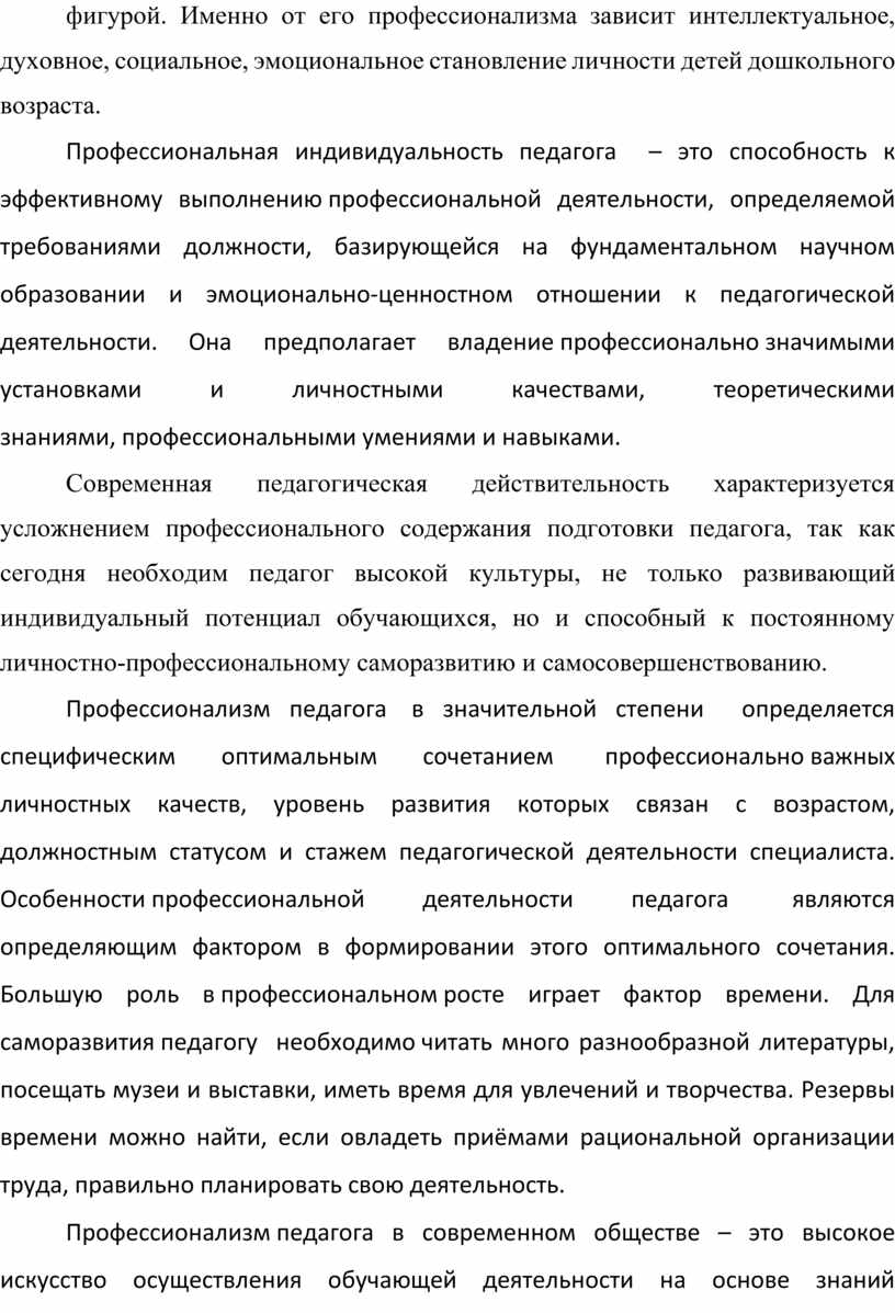 Профессионализм педагога в значительной степени определяется специфическим оптимальным сочетанием профессионально важных личностных качеств, уровень развития которых связан с возрастом, должностным статусом и стажем педагогической деятельности специалиста. Особенности профессиональной деятельности педагога являются определяющим фактором в формировании этого оптимального сочетания. Большую роль в профессиональном росте играет фактор времени. Для саморазвития педагогу необходимо читать много разнообразной литературы, посещать музеи и выставки, иметь время для увлечений и творчества. Резервы времени можно найти, если овладеть приёмами рациональной организации труда, правильно планировать свою деятельность.