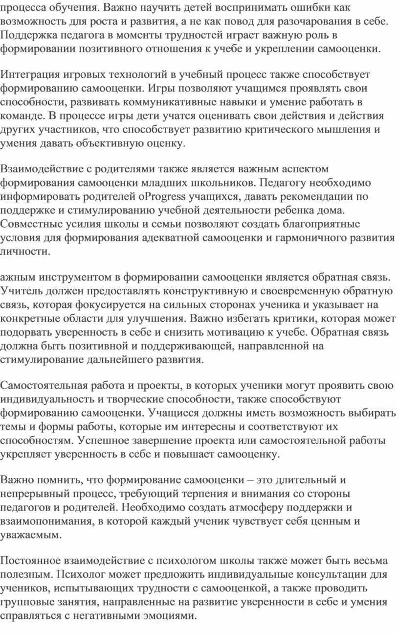 В заключение, целостный подход к формированию самооценки, включающий индивидуализацию обучения, поддержку в трудностях, интеграцию игровых технологий, конструктивную обратную связь и сотрудничество с родителями, является залогом успешного развития личности младшего школьника.