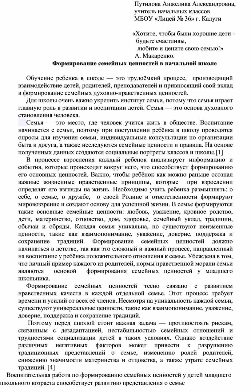 В процессе взросления каждый ребёнок анализирует информацию и события, которые происходят вокруг него, что способствует формированию его основных ценностей. Важно, чтобы ребёнок как можно раньше осознал важные жизненные нравственные принципы, которые при взрослении определят его взгляды на жизнь. Необходимо учить ребенка размышлять: о себе, о семье, о дружбе, о своей Родине и ответственности формируют мировоззрение и создают основу для успешной жизни. В семье формируются такие основные семейные ценности: любовь, уважение, кровное родство, дети, материнство, отцовство, дом, здоровье, семейный уклад, традиции, обычаи и обряды. Каждая семья уникальна, но существуют неизменные ценности, такие как взаимопонимание, уважение, доверие, поддержка и сохранение традиций. Формирование семейных ценностей должно начинаться в детстве, так как это сложный и важный процесс, направленный на воспитание у ребёнка положительного отношения к семье. Убеждена в том, что личный пример каждого из родителей, нормы нравственной морали семьи являются основой формирования семейных ценностей у младшего школьника.