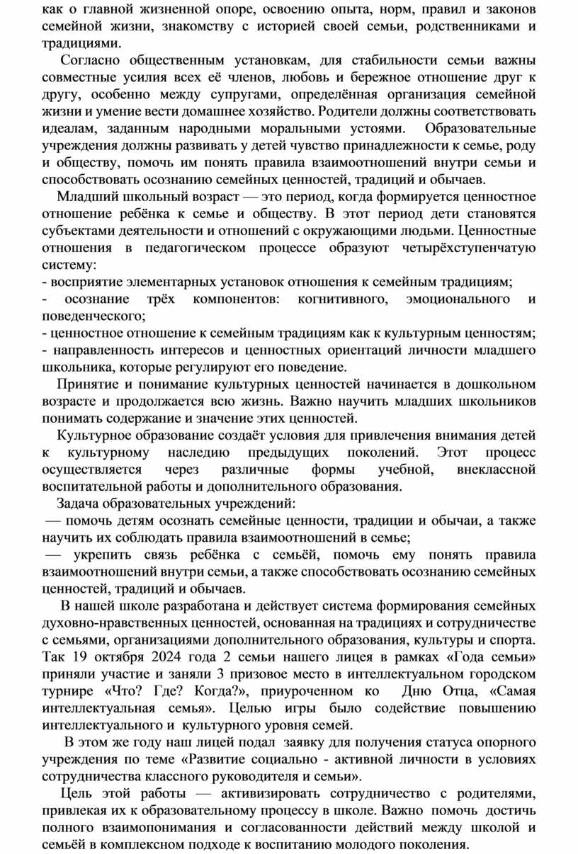 В нашей школе разработана и действует система формирования семейных духовно-нравственных ценностей, основанная на традициях и сотрудничестве с семьями, организациями дополнительного образования, культуры и спорта. Так 19 октября 2024 года 2 семьи нашего лицея в рамках «Года семьи» приняли участие и заняли 3 призовое место в интеллектуальном городском турнире «Что? Где? Когда?», приуроченном ко Дню Отца, «Самая интеллектуальная семья». Целью игры было содействие повышению интеллектуального и культурного уровня семей.