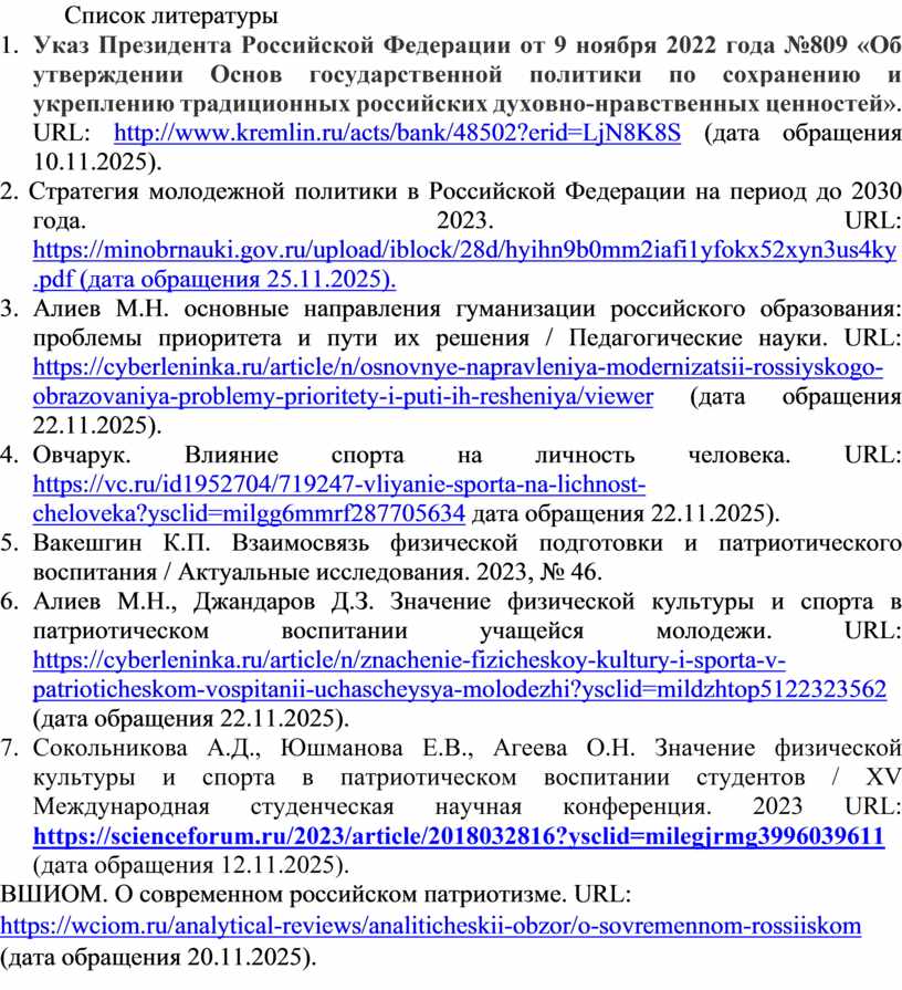 1. Указ Президента Российской Федерации от 9 ноября 2022 года №809 «Об утверждении Основ государственной политики по сохранению и укреплению традиционных российских духовно-нравственных ценностей». URL: http://www.kremlin.ru/acts/bank/48502?erid=LjN8K8S (дата обращения 10.11.2025).
