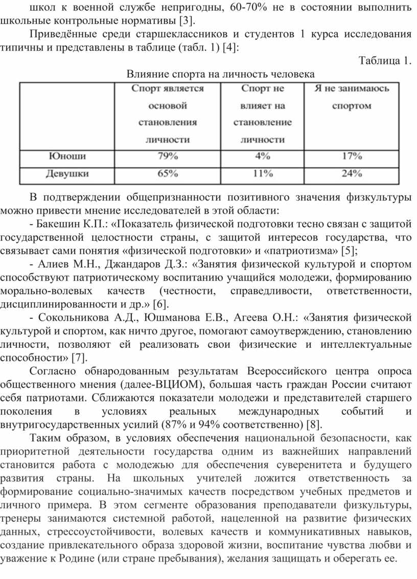 Таким образом, в условиях обеспечения национальной безопасности, как приоритетной деятельности государства одним из важнейших направлений становится работа с молодежью для обеспечения суверенитета и будущего развития страны. На школьных учителей ложится ответственность за формирование социально-значимых качеств посредством учебных предметов и личного примера. В этом сегменте образования преподаватели физкультуры, тренеры занимаются системной работой, нацеленной на развитие физических данных, стрессоустойчивости, волевых качеств и коммуникативных навыков, создание привлекательного образа здоровой жизни, воспитание чувства любви и уважение к Родине (или стране пребывания), желания защищать и оберегать ее.