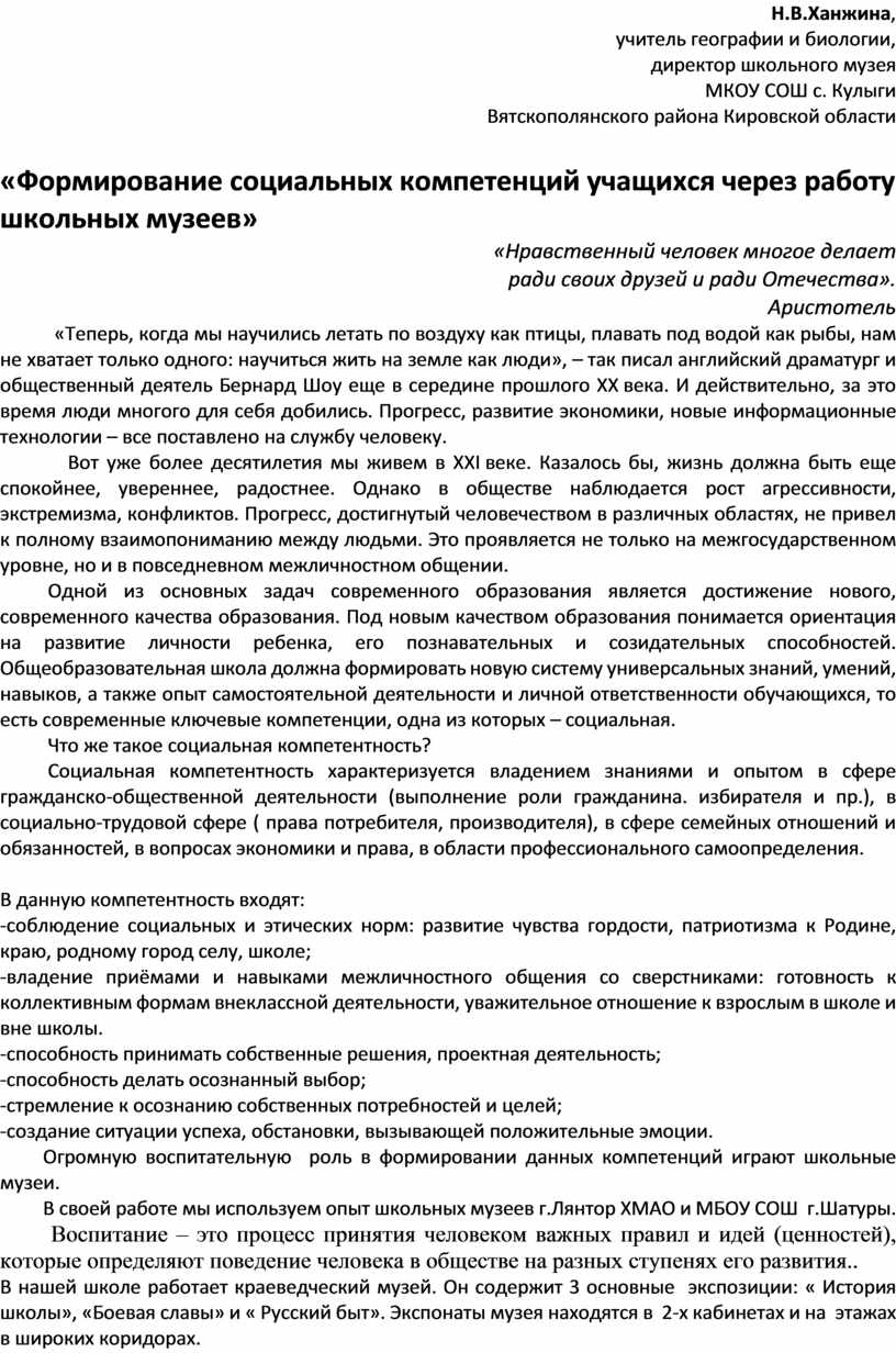 «Формирование социальных компетенций учащихся через работу школьных музеев»