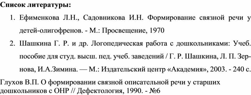 3. Глухов В.П. О формировании связной описательной речи у старших дошкольников с ОНР // Дефектология, 1990. - №6